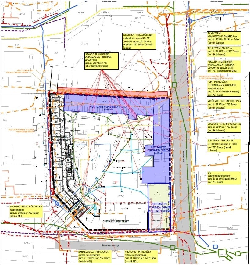Predmet projekta je, za potrebe novogradnje, odstranitev dveh obstoječih objektov na SV strani obravnavanega območja. Rušenje dela zunanje ureditve oz. zunanjega stopnišča in zelenice za dostop na gradbišče. Premestitev montažnega objekta UL MF na Korytkovo 2.